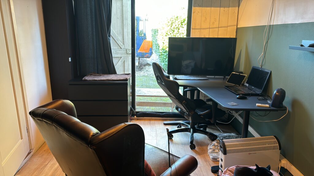 Want ja, hoe doen we het nu met onze eigen woonsituatie. We hebben geen badkamer, geen wc en geen woonkamer. Nou.. gelukkig hebben we een huis wat opgedeeld was in allemaal kleine hokjes. Zo was, of eigenlijk is, er een bijgebouw waarin ik mijn kantoor had, maar waar ook de keuken zit. Dus onze keuken hebben we nog, en mijn werkplek is omgetoverd tot een mini woonkamer en de werkbank van mijn vriend. Ook hebben we daar een safe spot voor Tjallie onze kat.